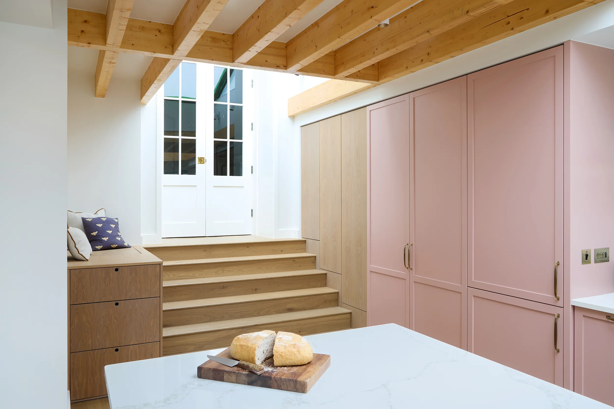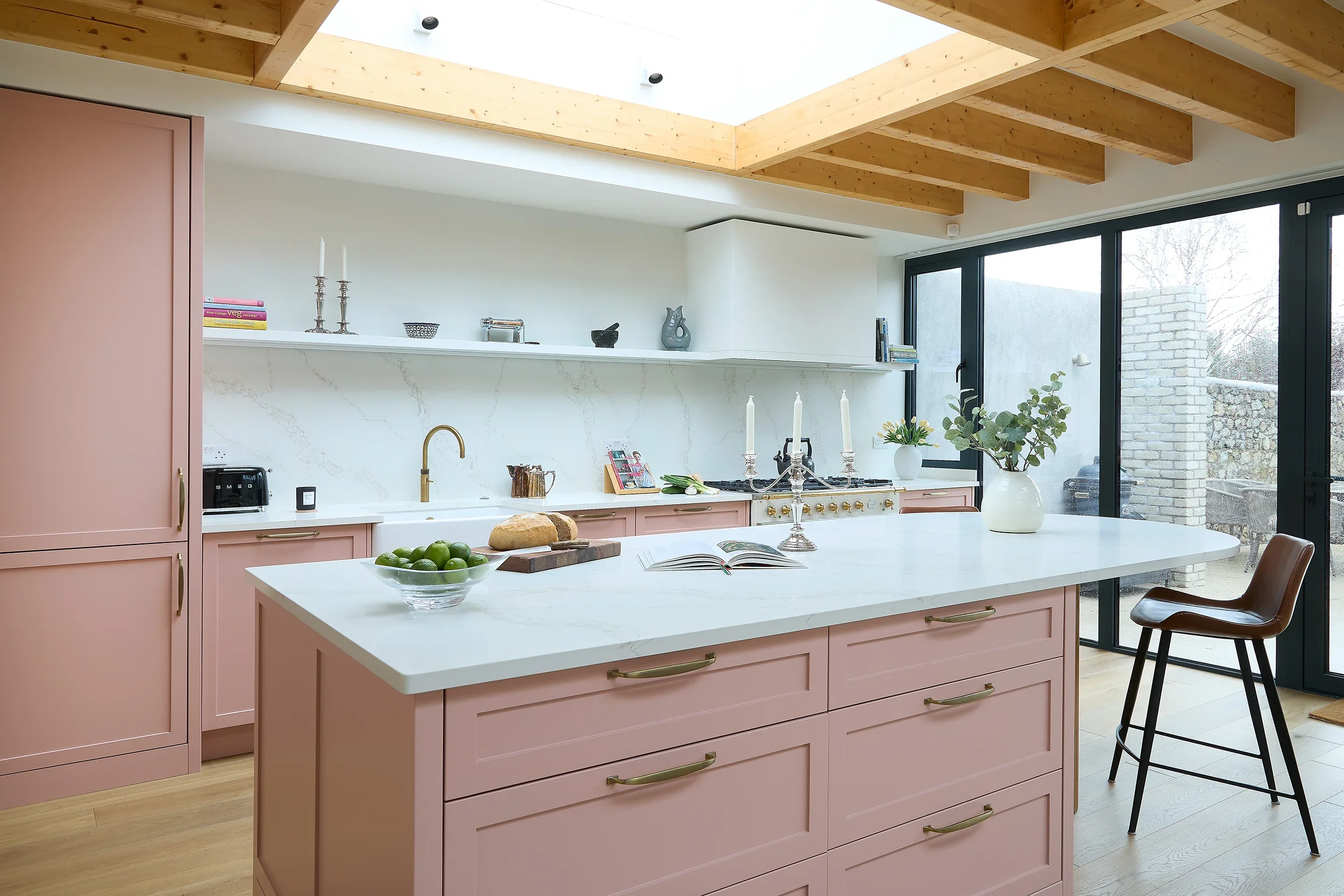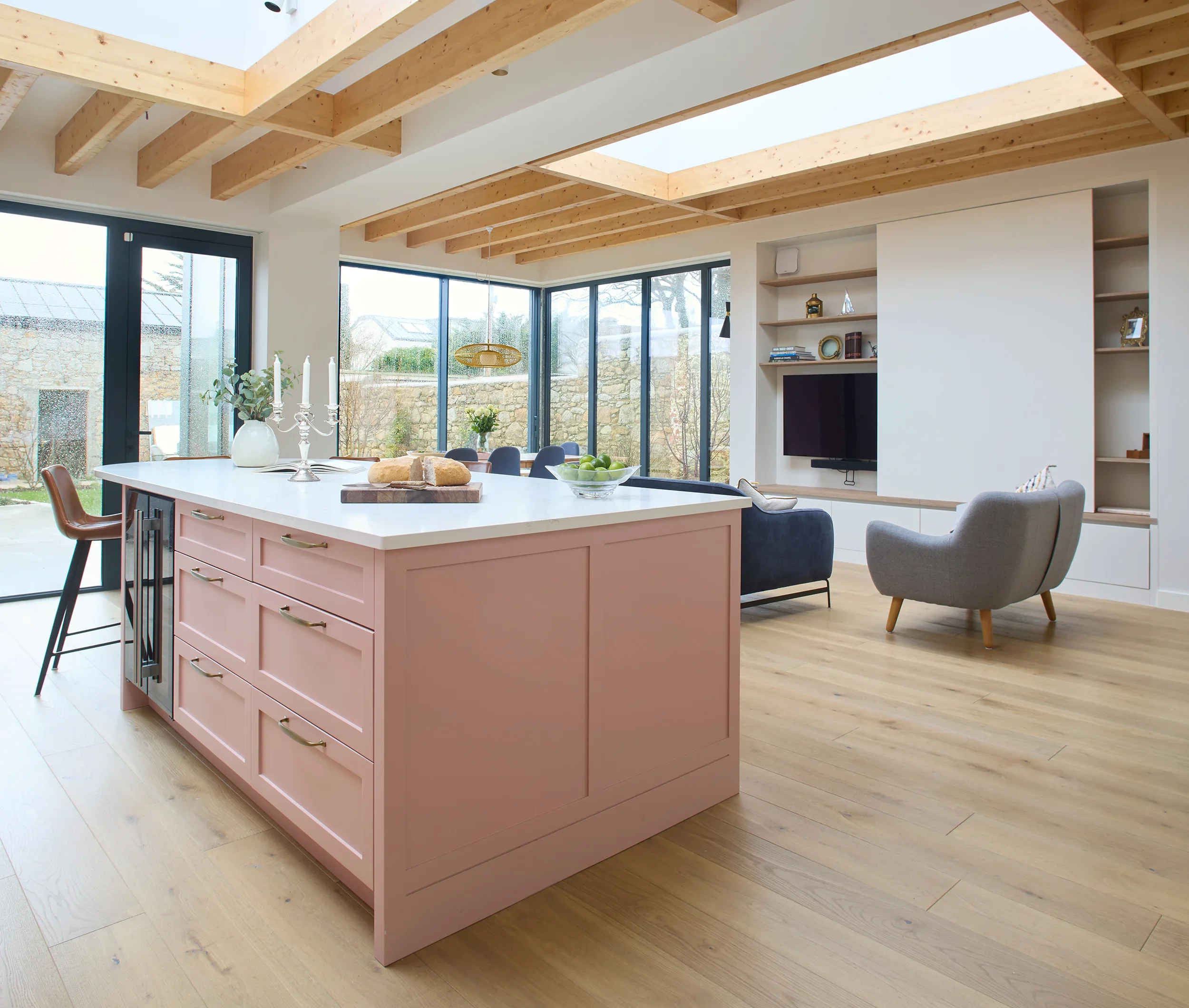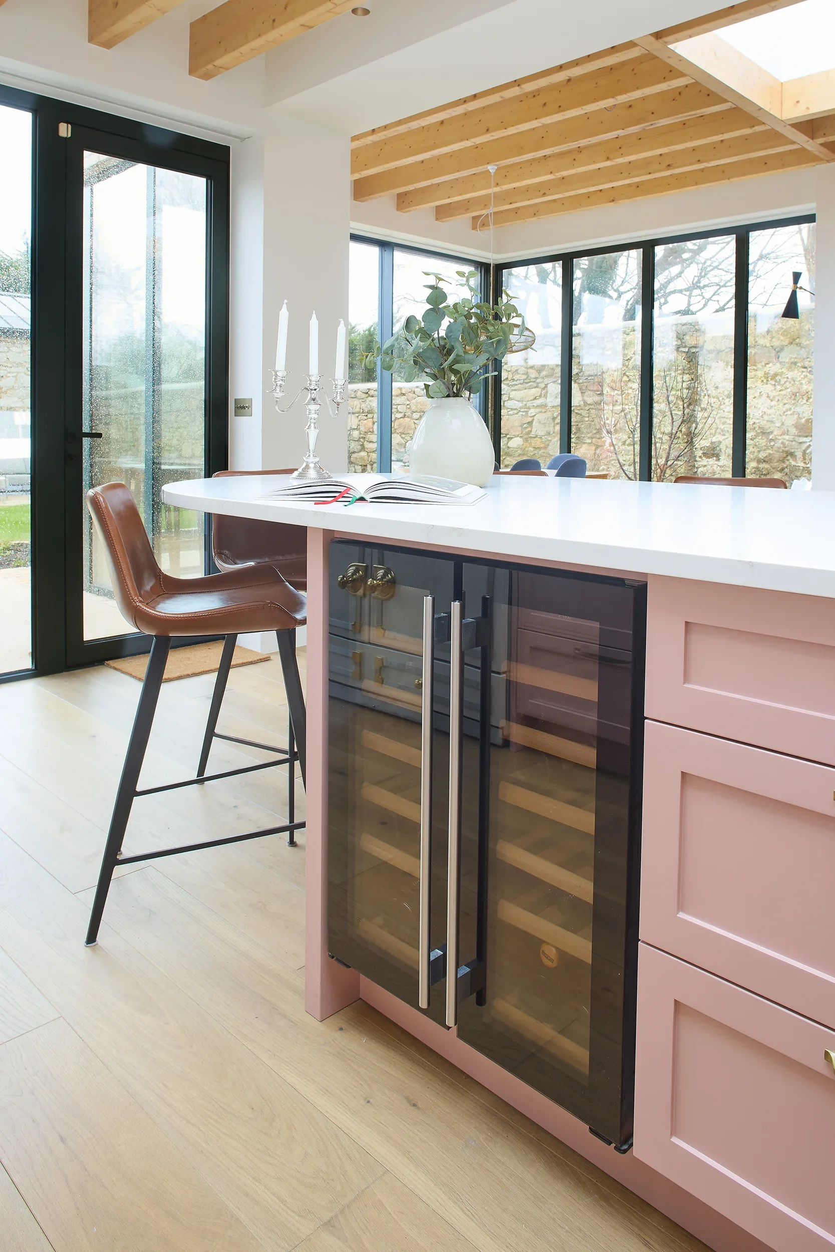 Betsy Pink & Oak, Monkstown Finishes: Betsy Pink ‘Alto’ doors with antique brass handles. European white oak ply storage. White veined Silestone full-height backsplash and work surfaces. Knockrea drinks & coffee station unit with pocket doors.