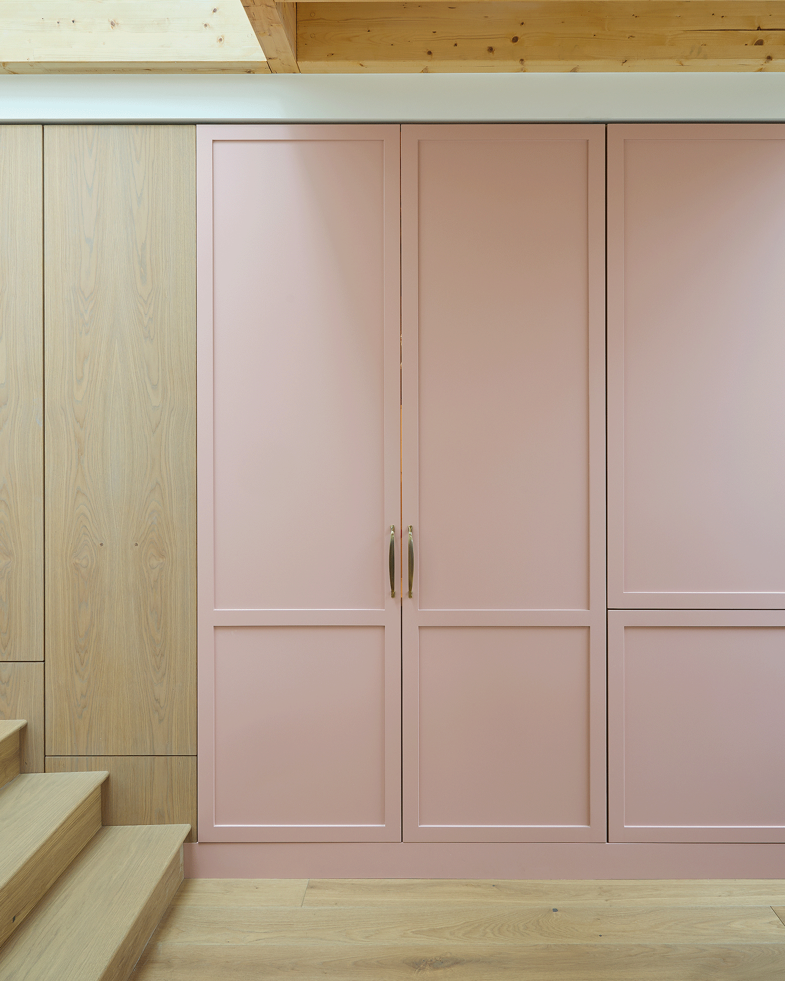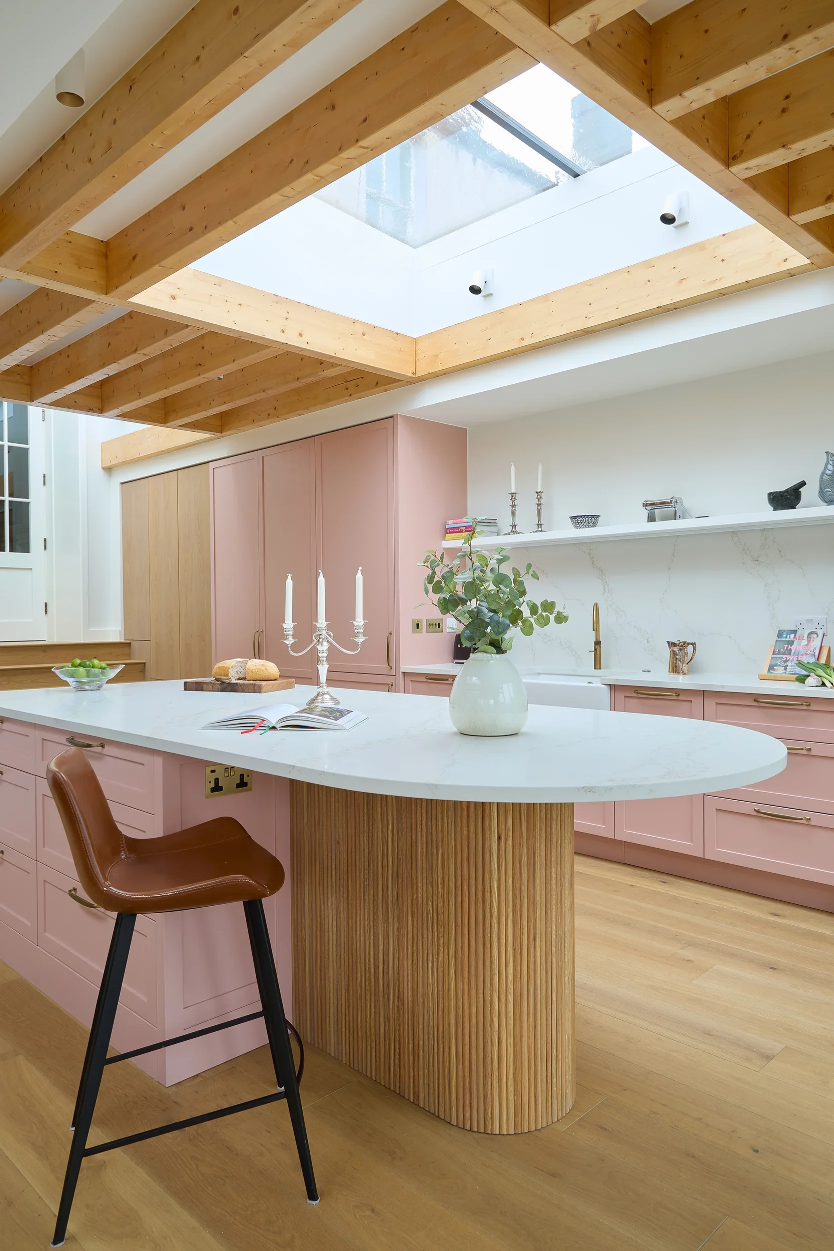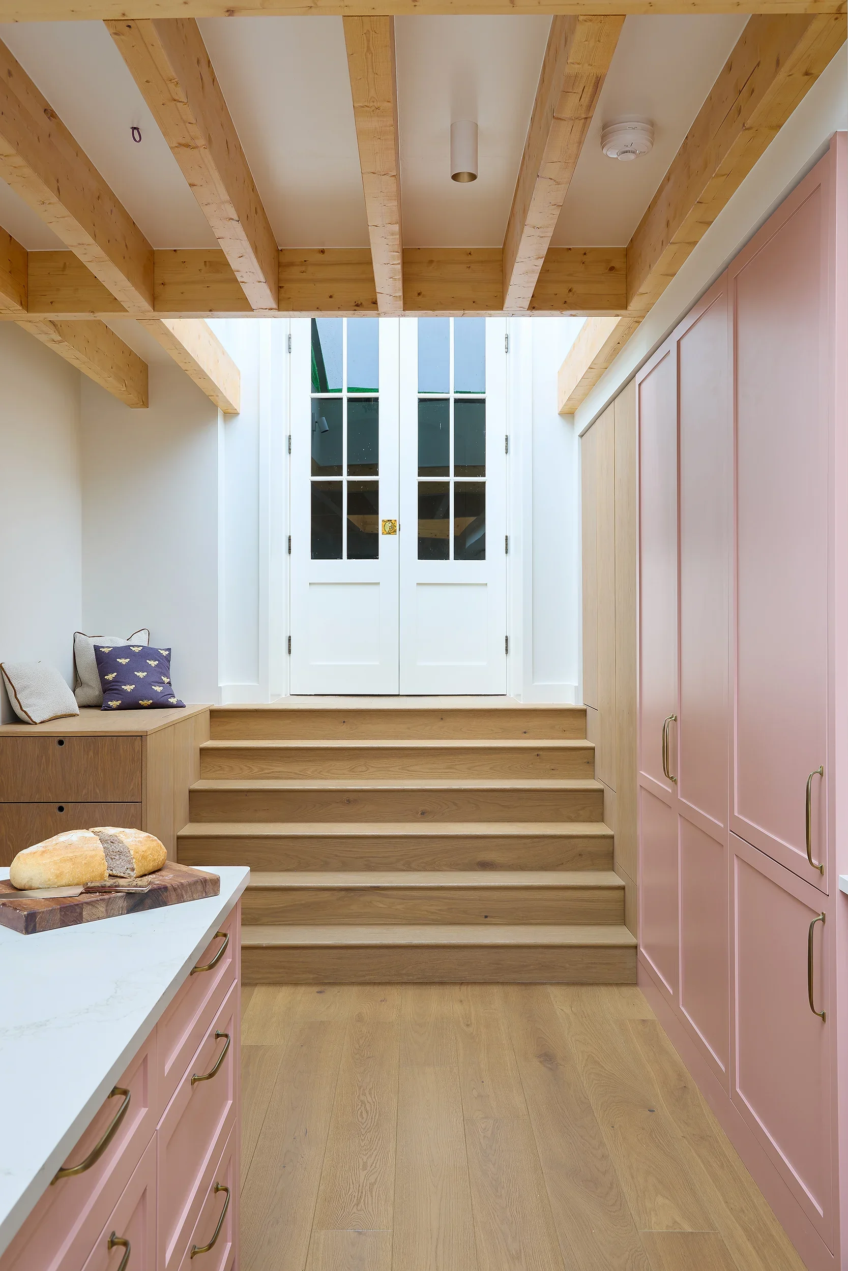 Betsy Pink & Oak, Monkstown Finishes: Betsy Pink ‘Alto’ doors with antique brass handles. European white oak ply storage. White veined Silestone full-height backsplash and work surfaces. Knockrea drinks & coffee station unit with pocket doors.