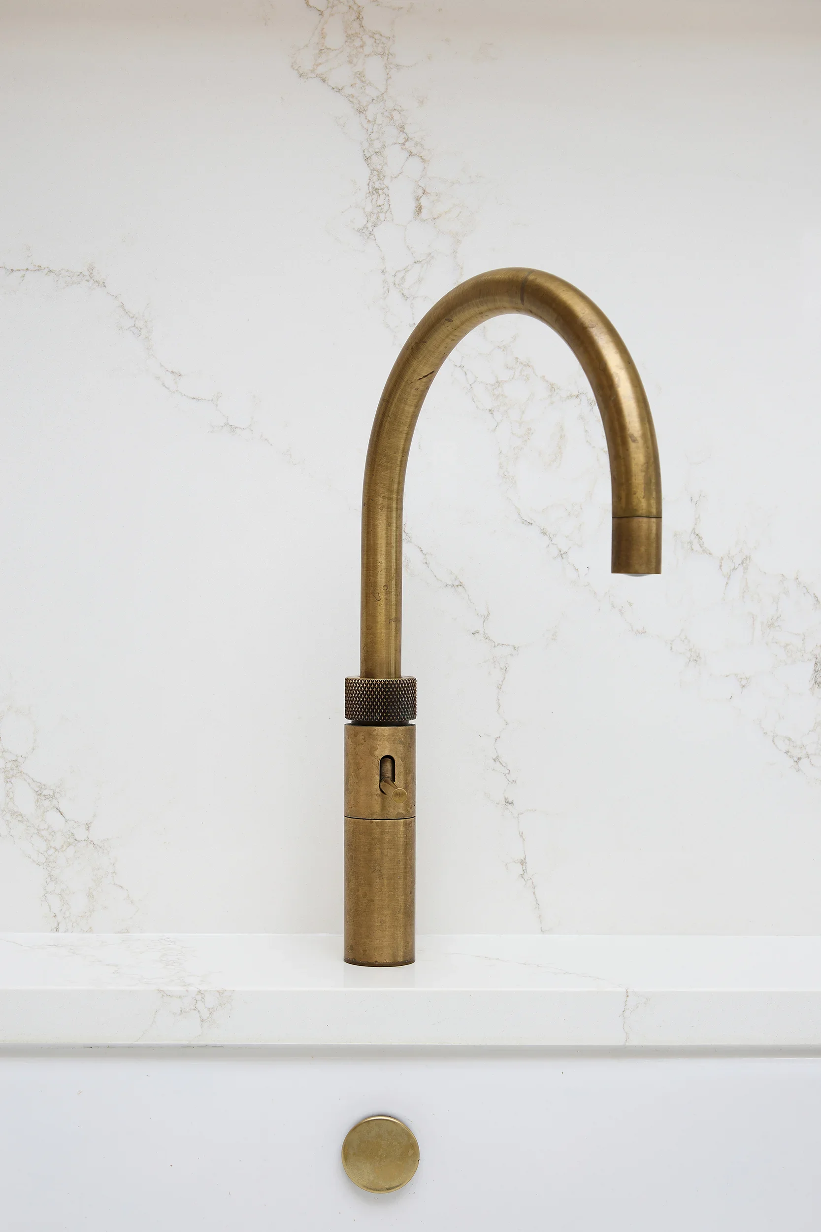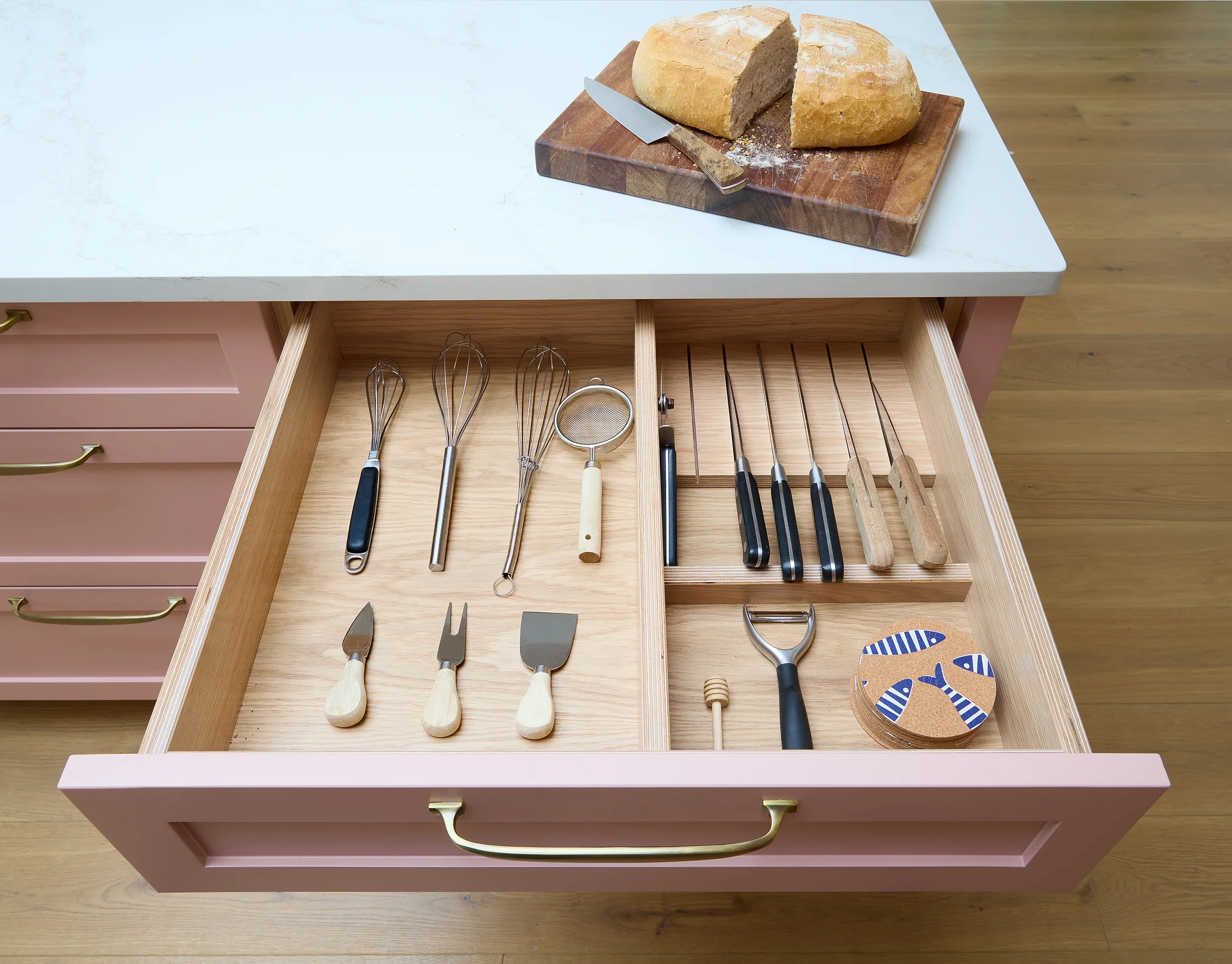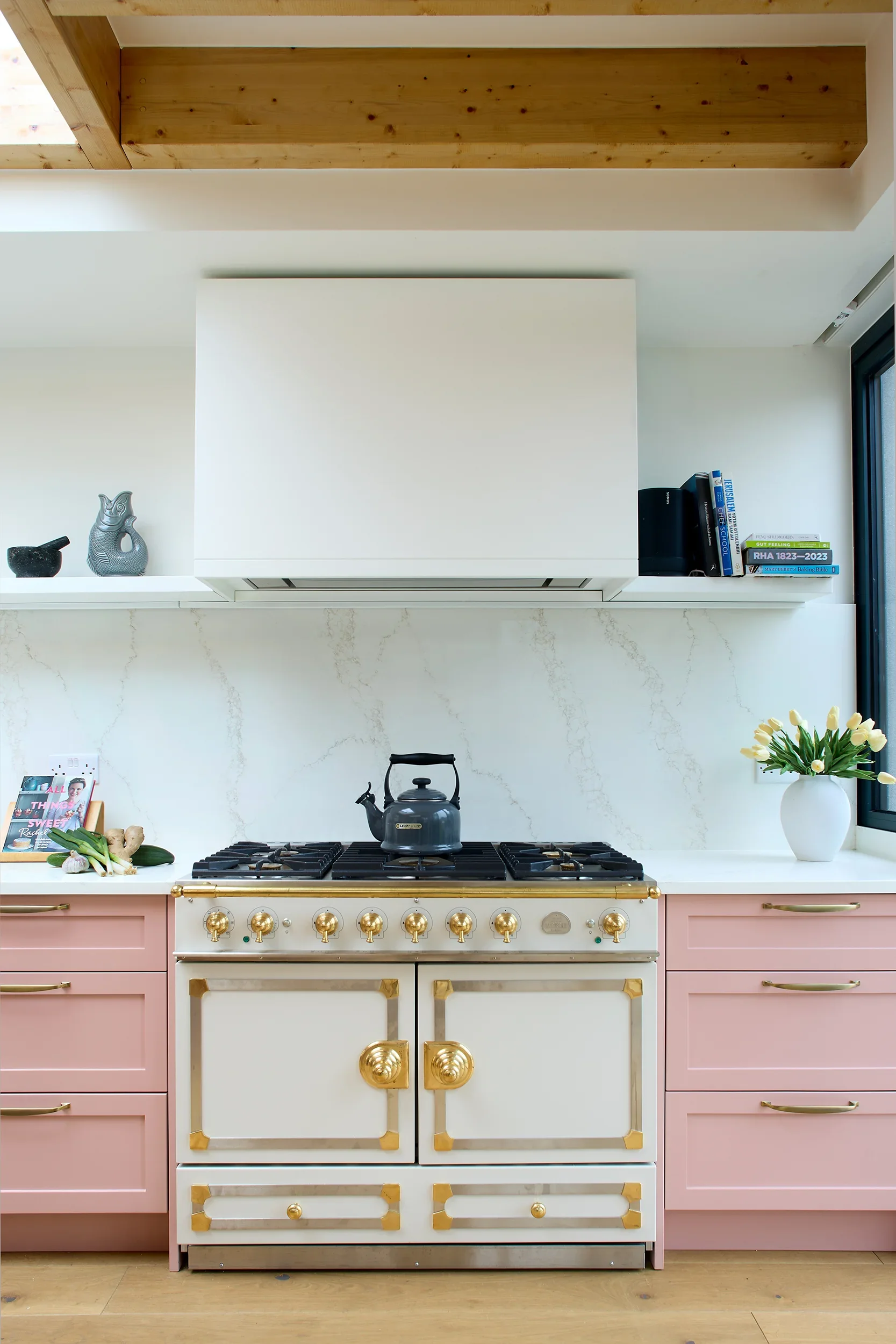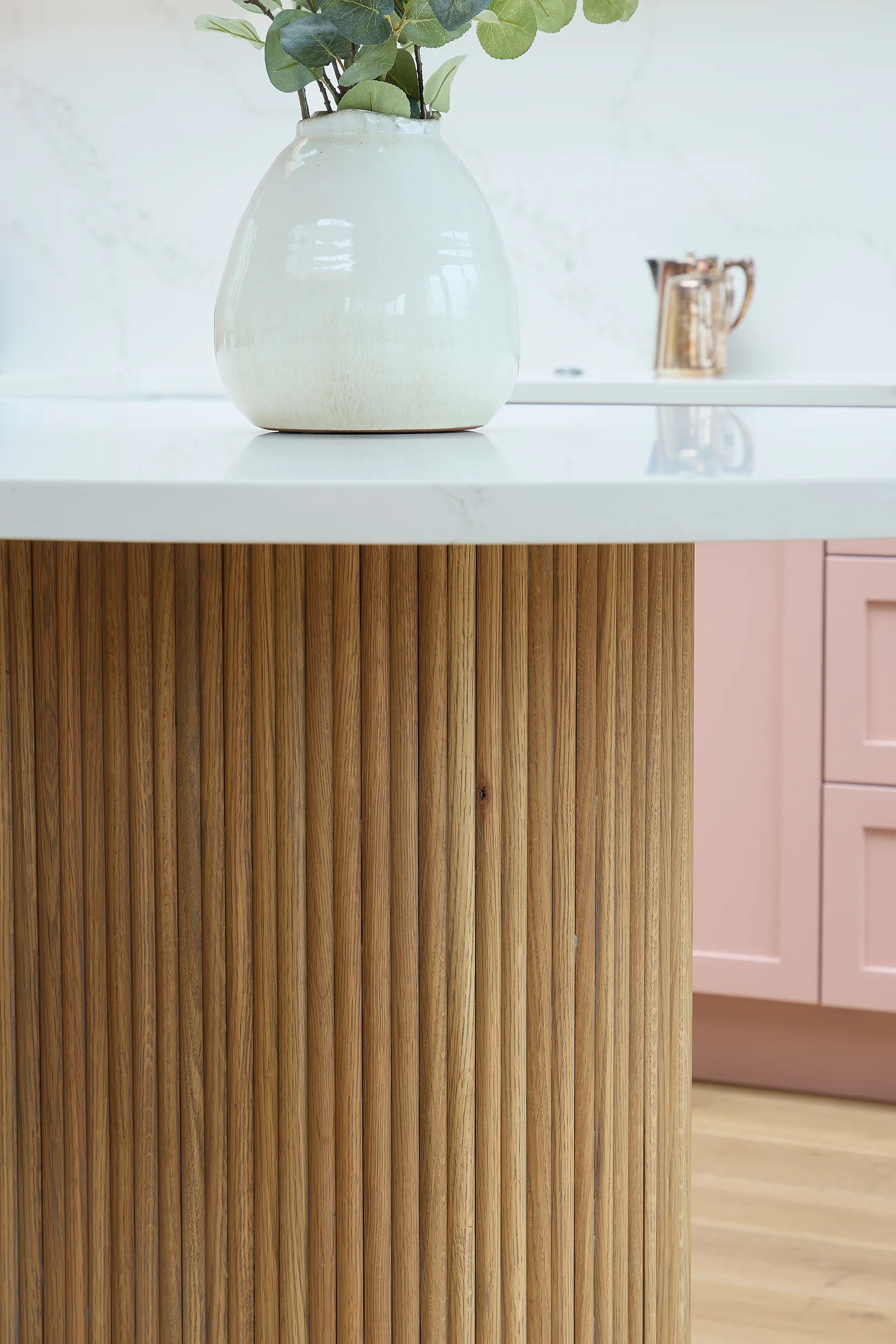Betsy Pink & Oak, Monkstown Finishes: Betsy Pink ‘Alto’ doors with antique brass handles. European white oak ply storage. White veined Silestone full-height backsplash and work surfaces. Knockrea drinks & coffee station unit with pocket doors.