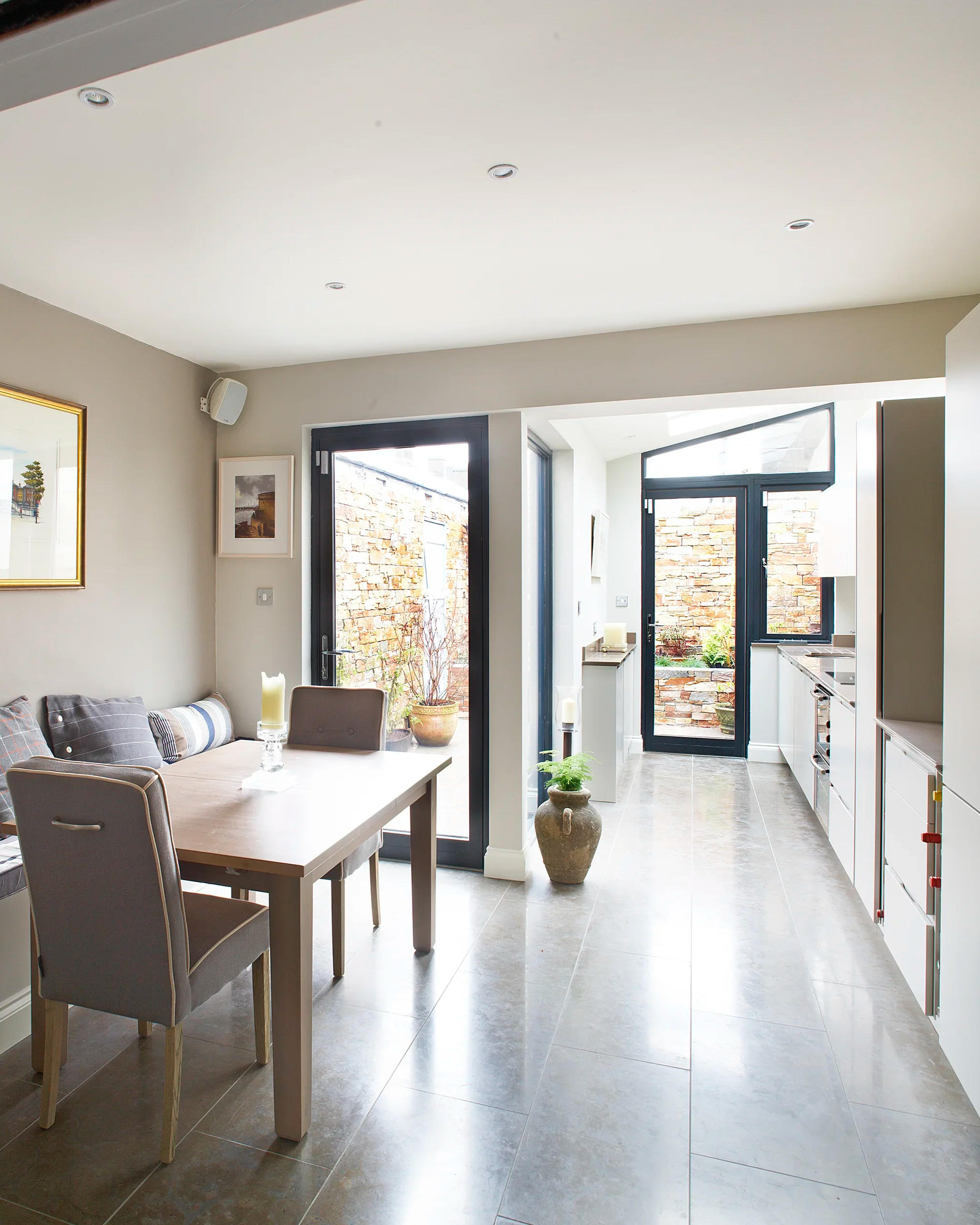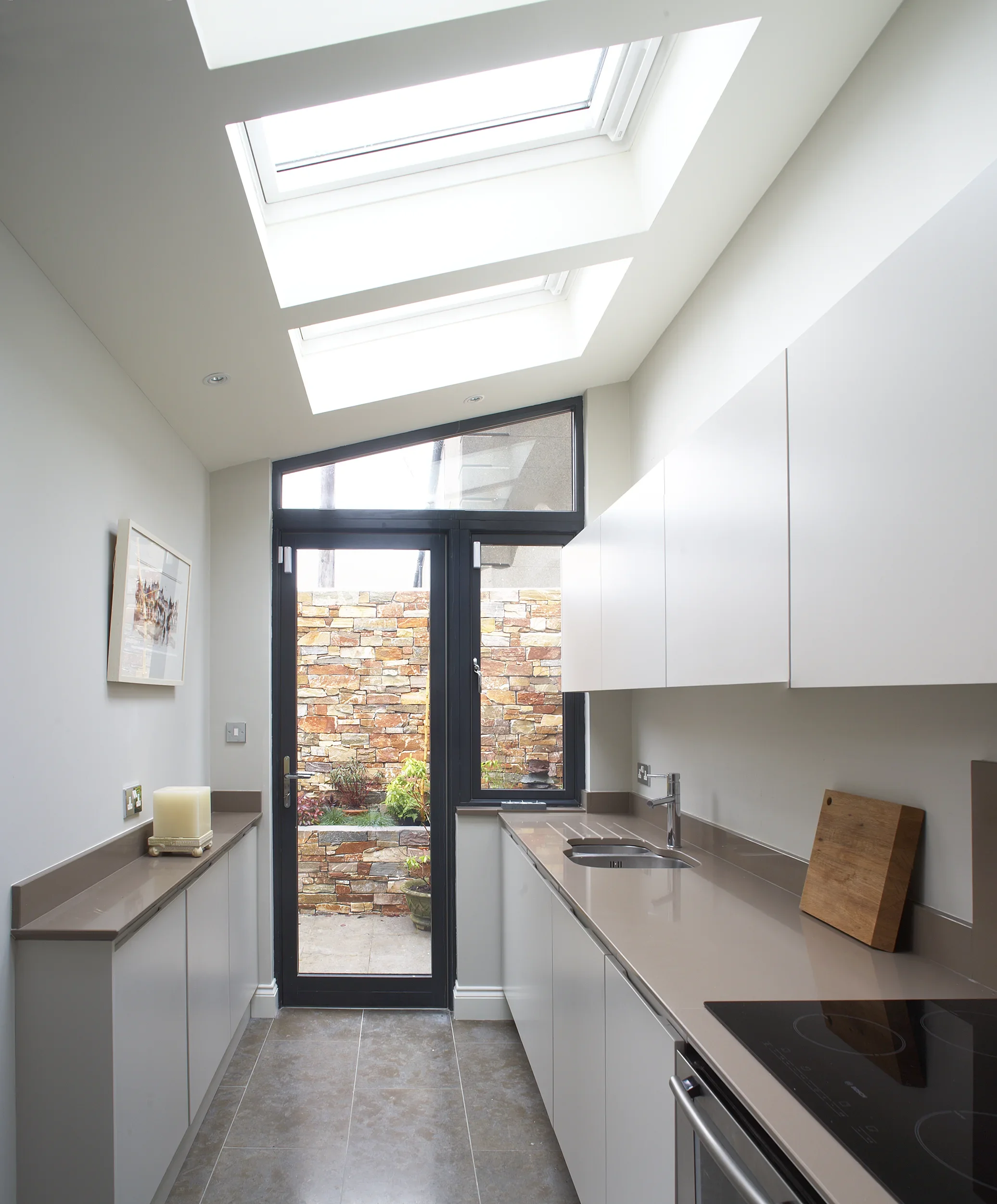 Cornforth White, Blackrock Finishes: Cornforth White ‘Linno’ handleless doors. Linear three bay design (kitchen, baking, display). Silestone Unsui Slab work surfaces and backsplash.