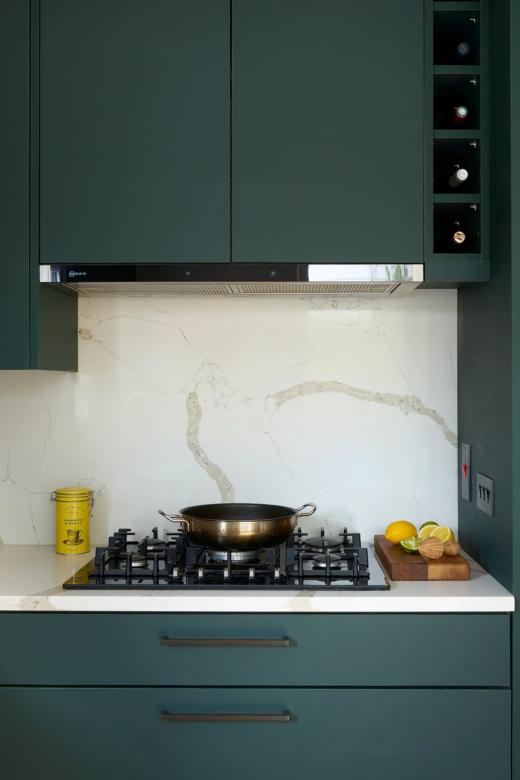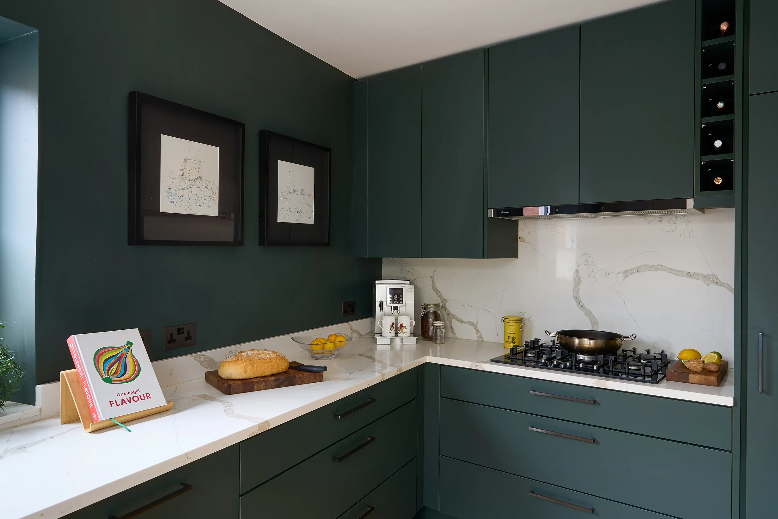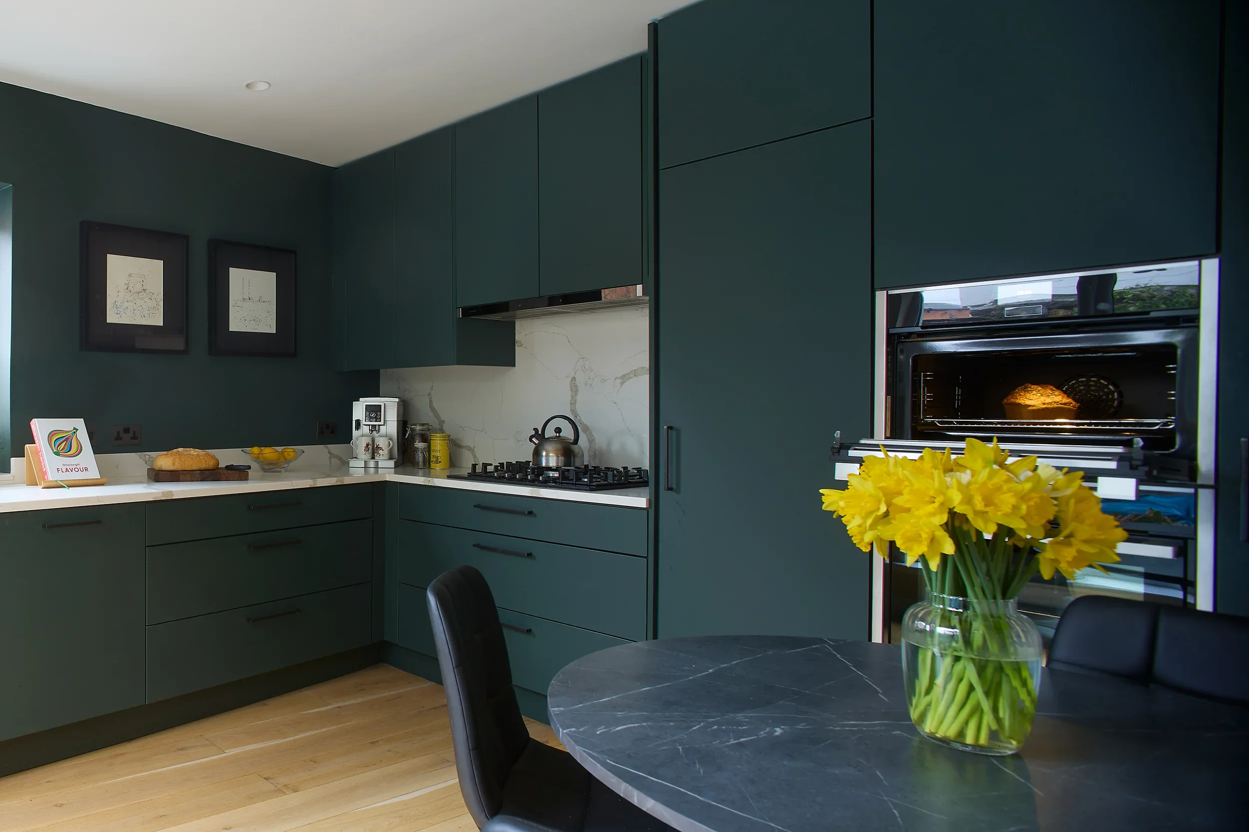 Dark Olive, Seapoint Features: Technical Matt Verde (Dark Olive) ‘Tablet’ doors with black handles. Deep-veined Silestone work surfaces. Built-in Knockrea pantry.