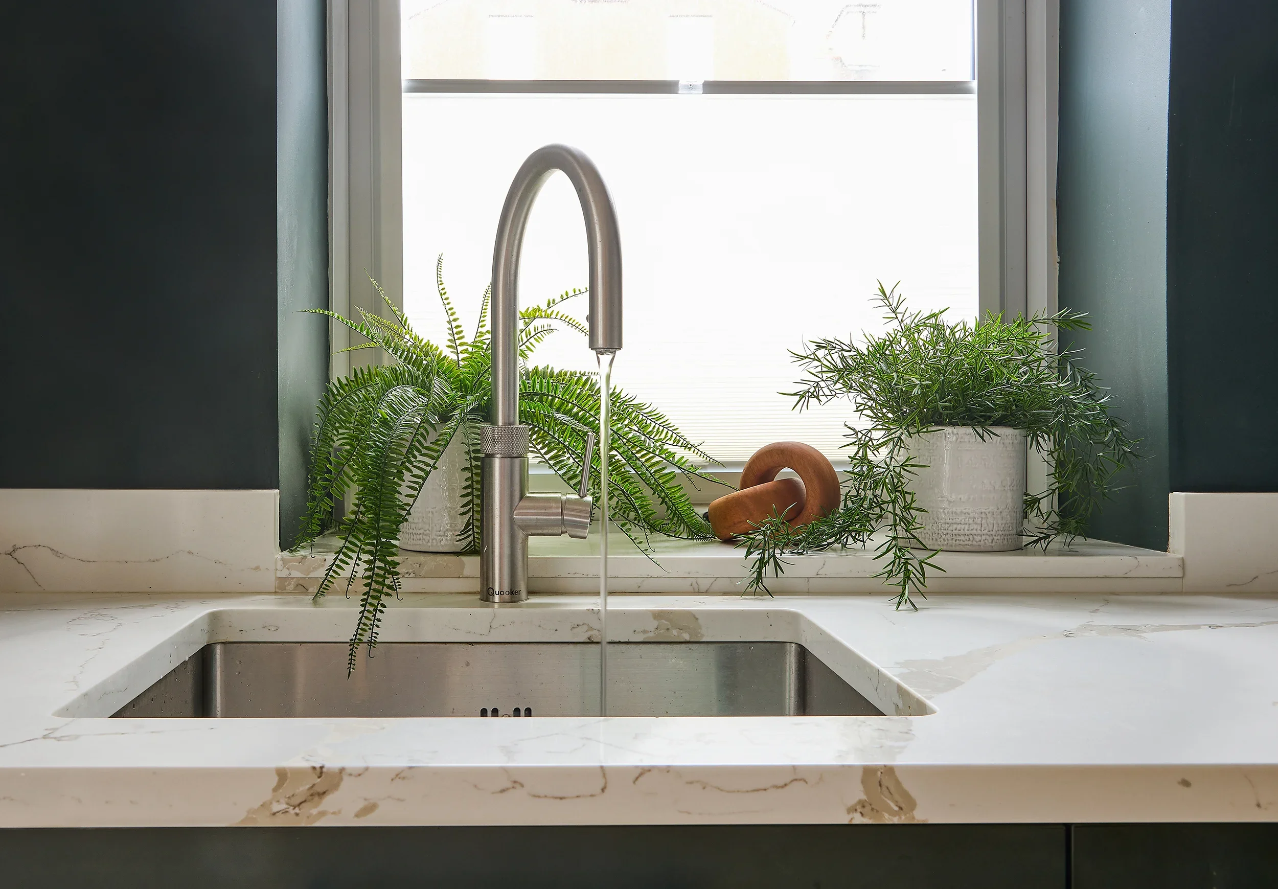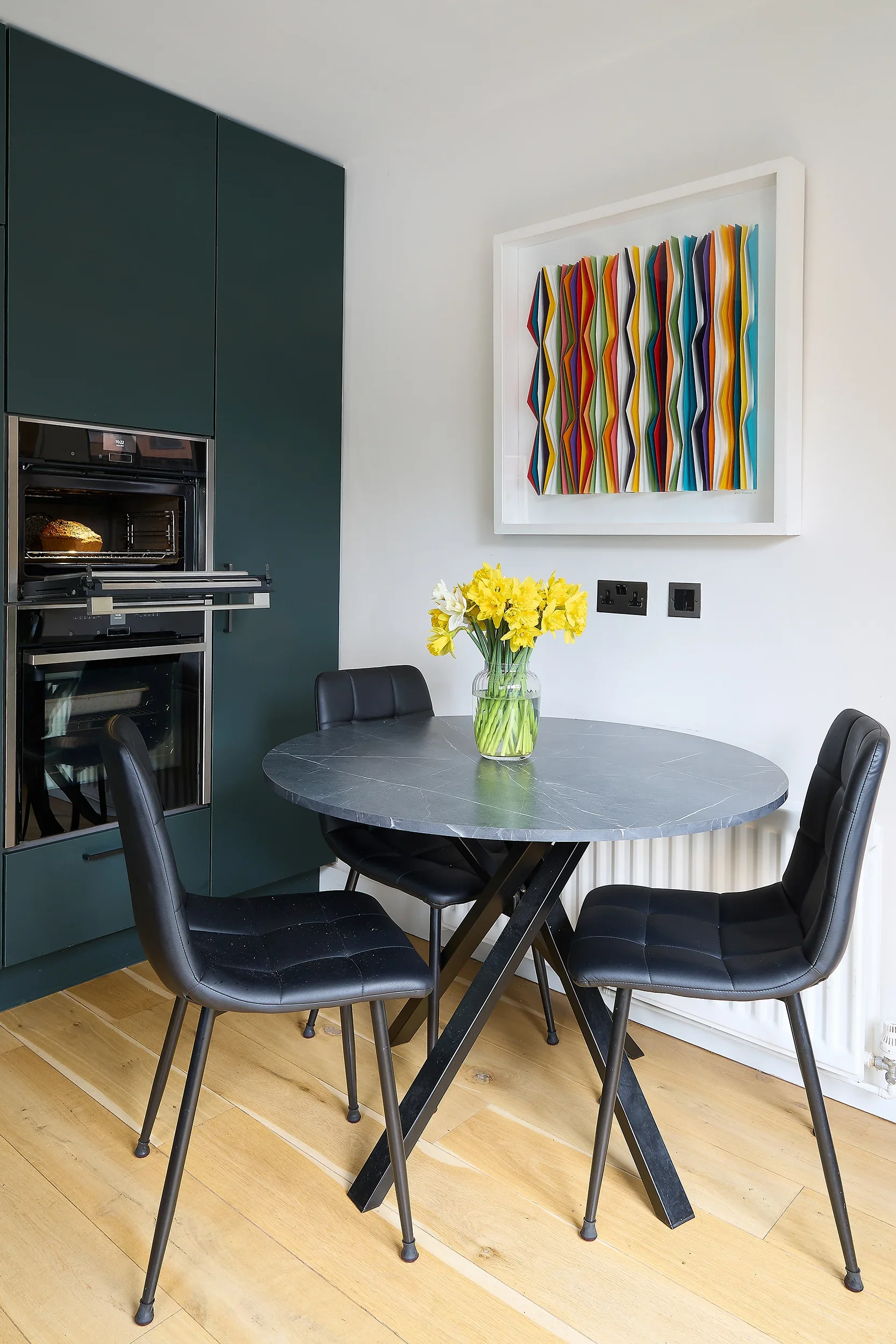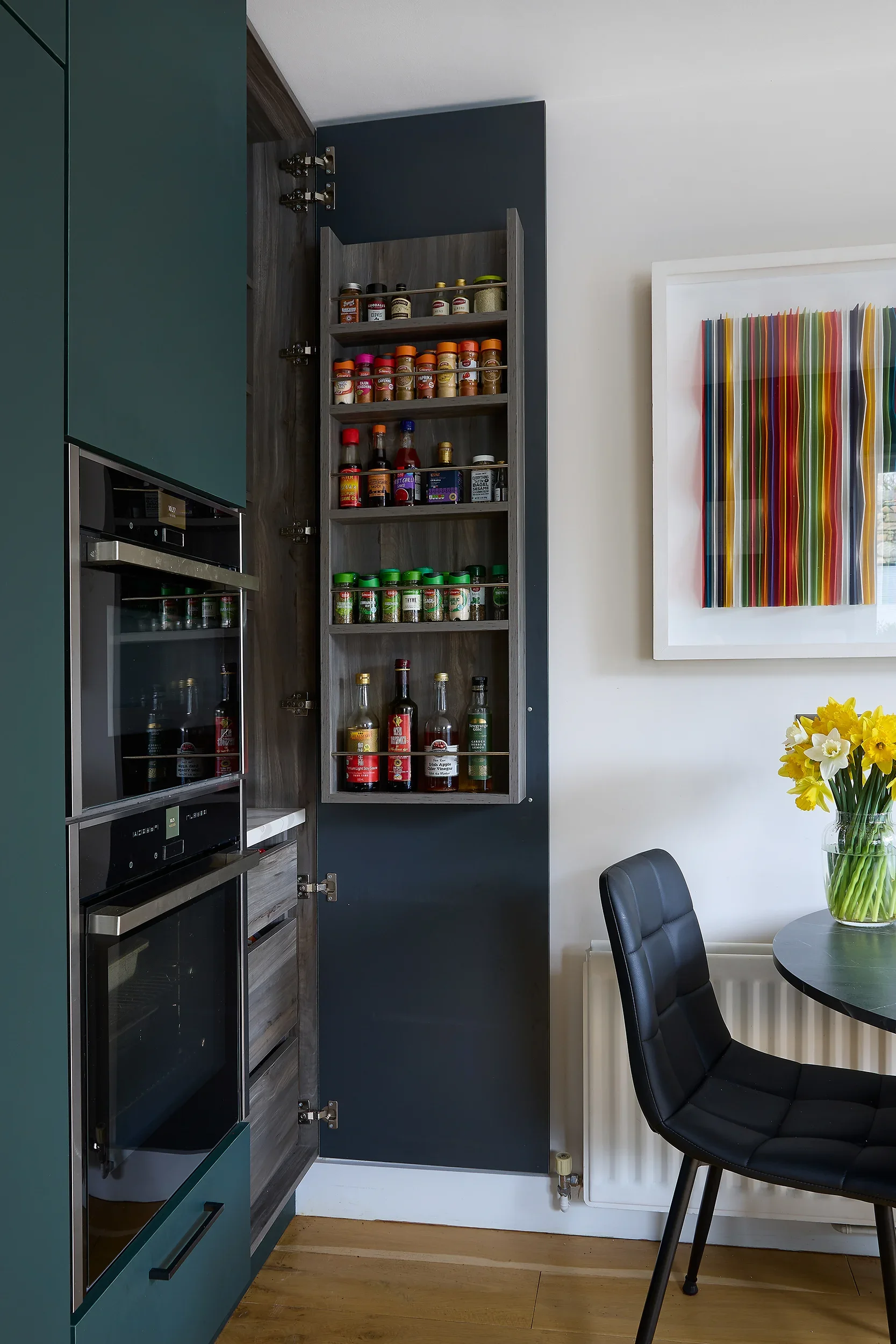 Dark Olive, Seapoint Features: Technical Matt Verde (Dark Olive) ‘Tablet’ doors with black handles. Deep-veined Silestone work surfaces. Built-in Knockrea pantry.