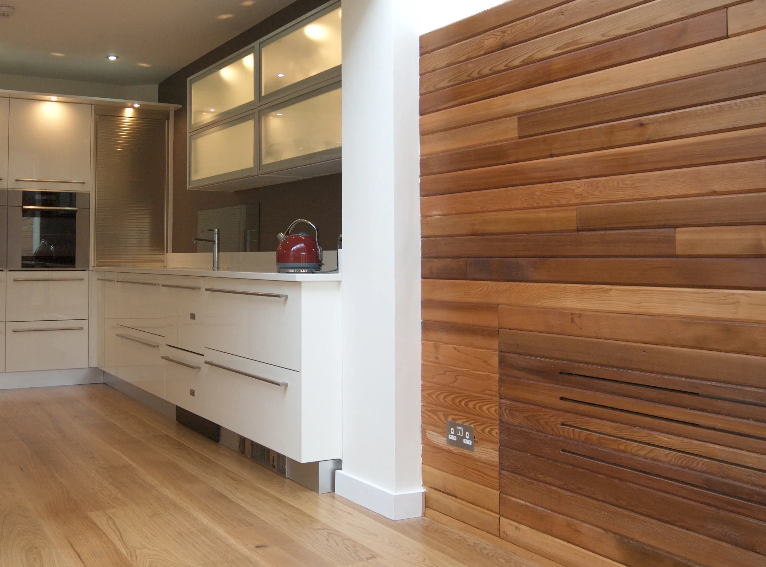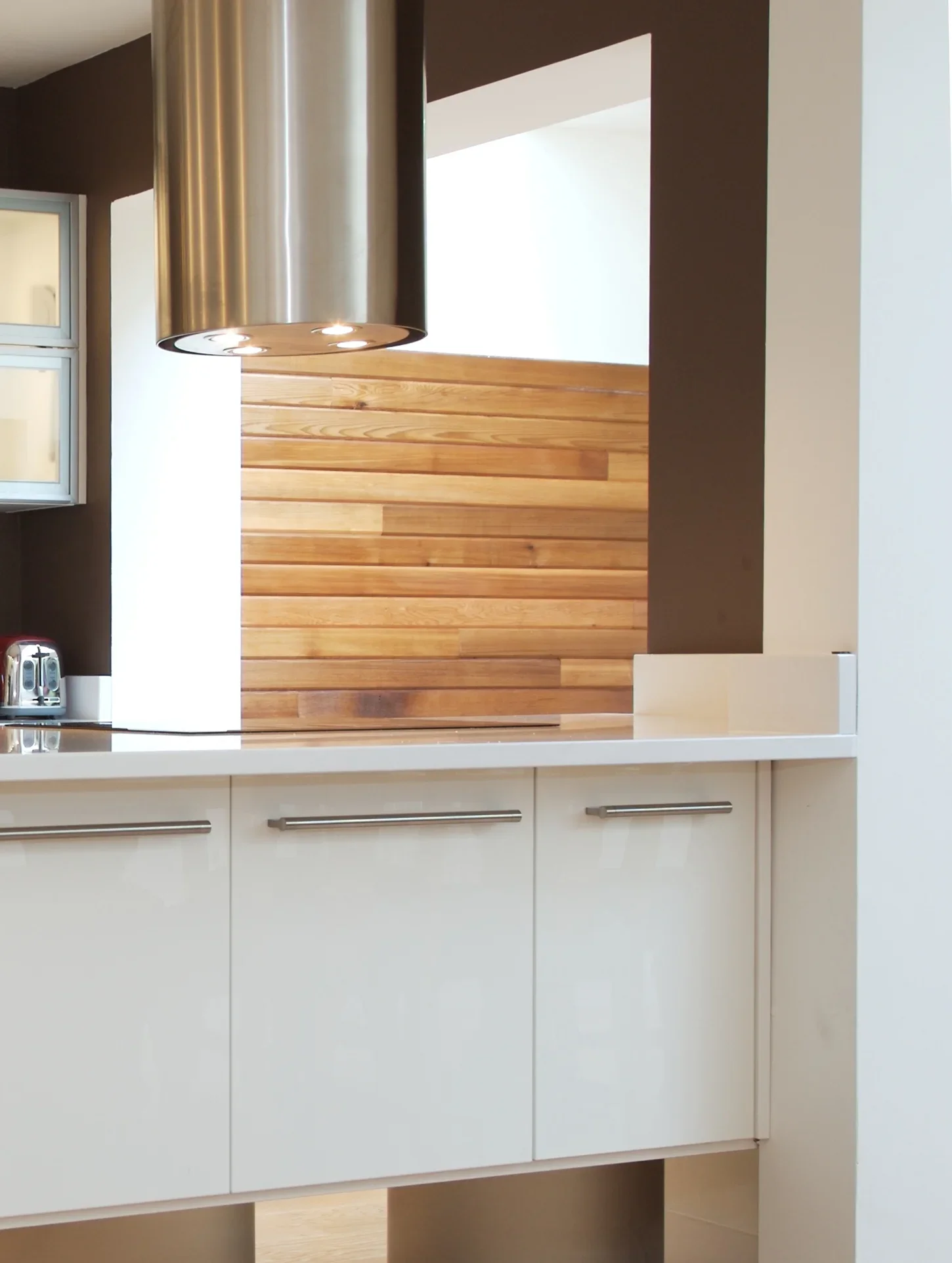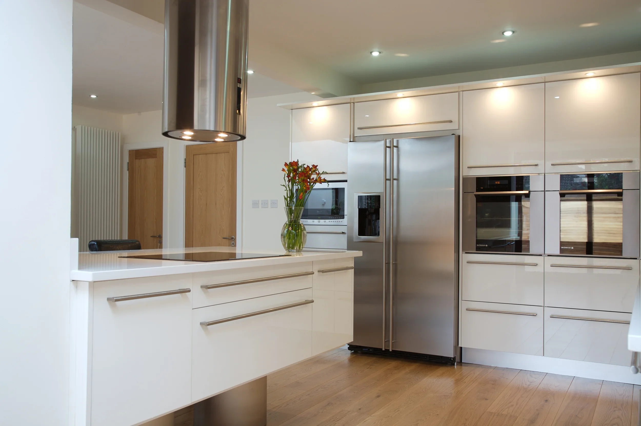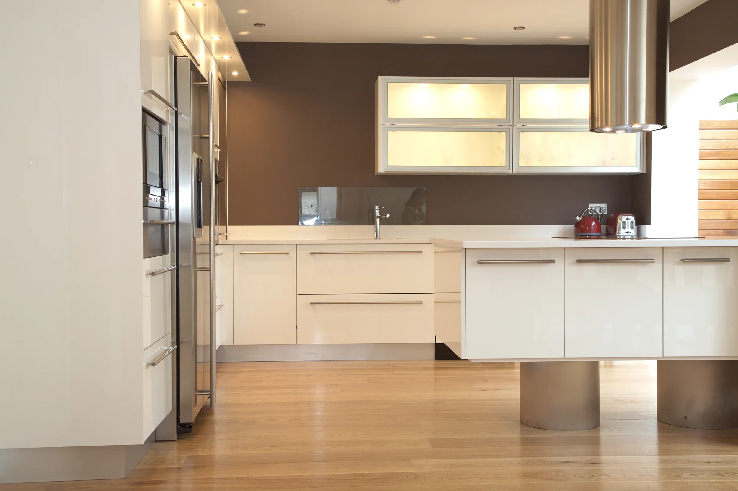 High Gloss White, Greystones Finishes: High gloss white ‘Tablet’ doors. Brushed steel bar handles. Feature island unit with white Silestone stone work surface. Feature stainless steel cylindrical extractor. Cedar wall panelling.