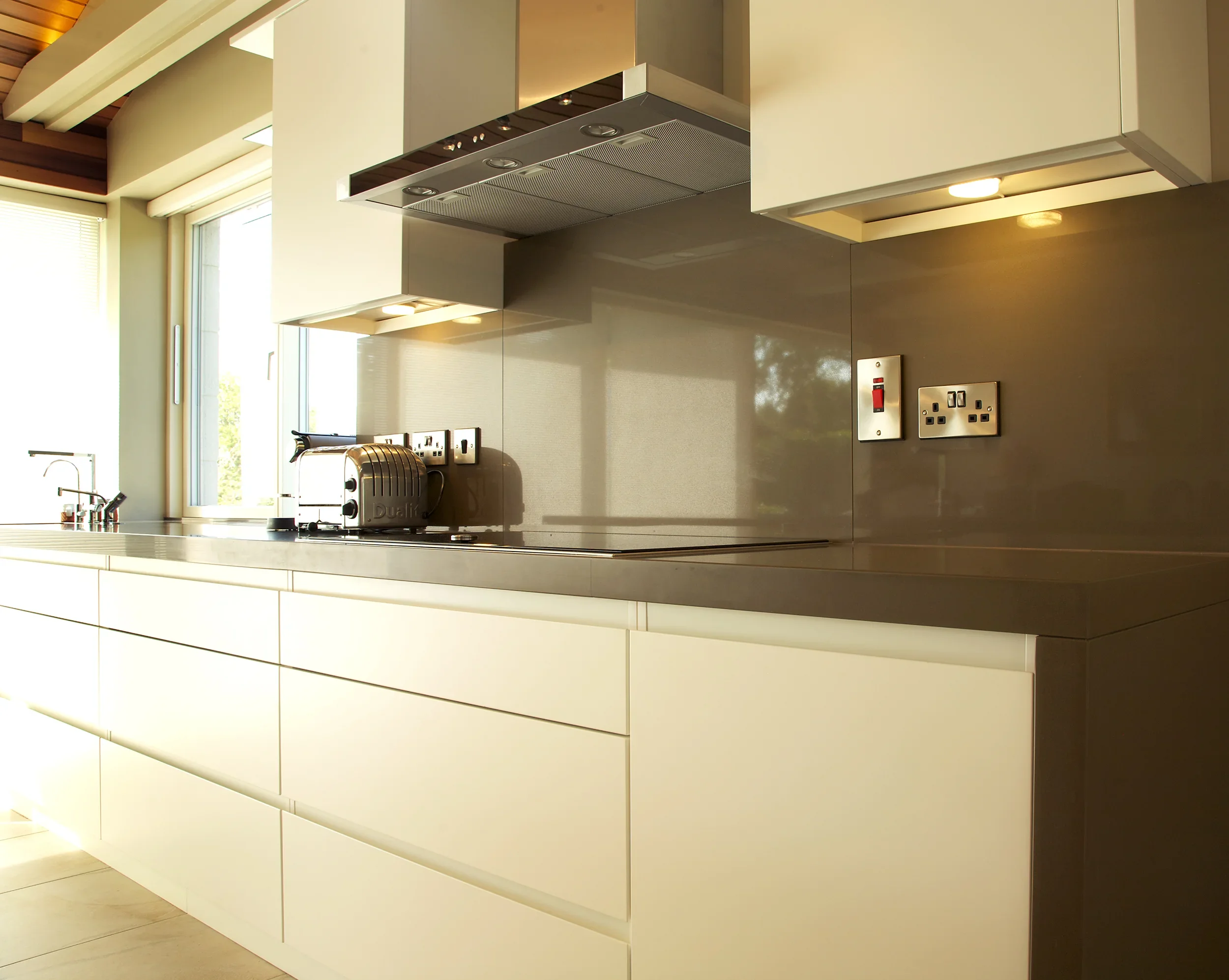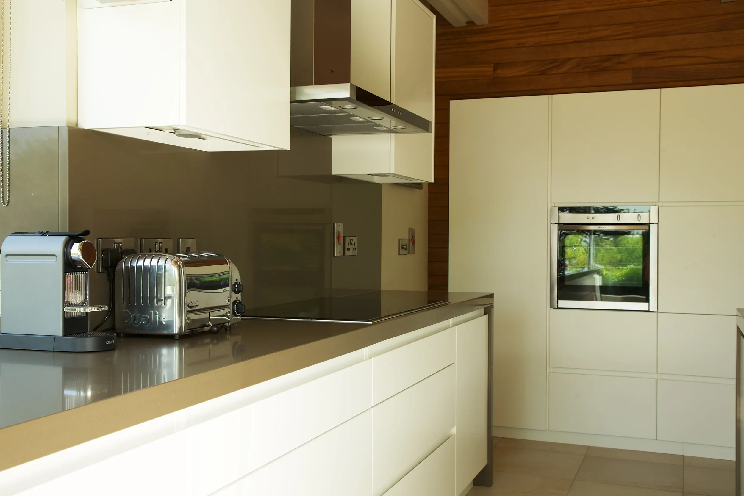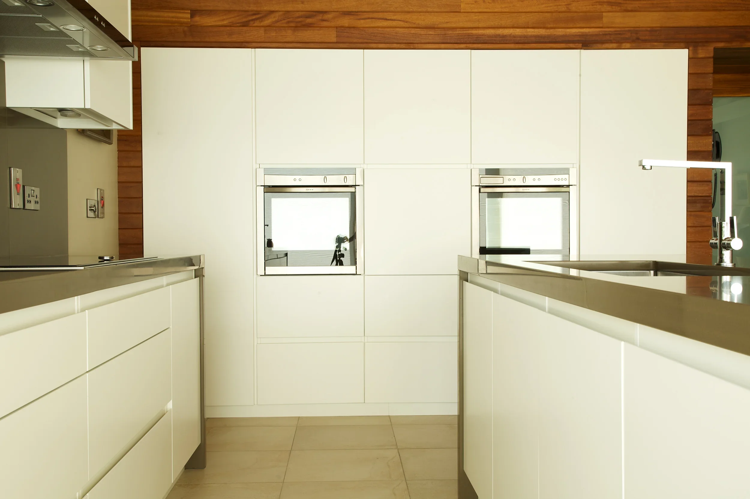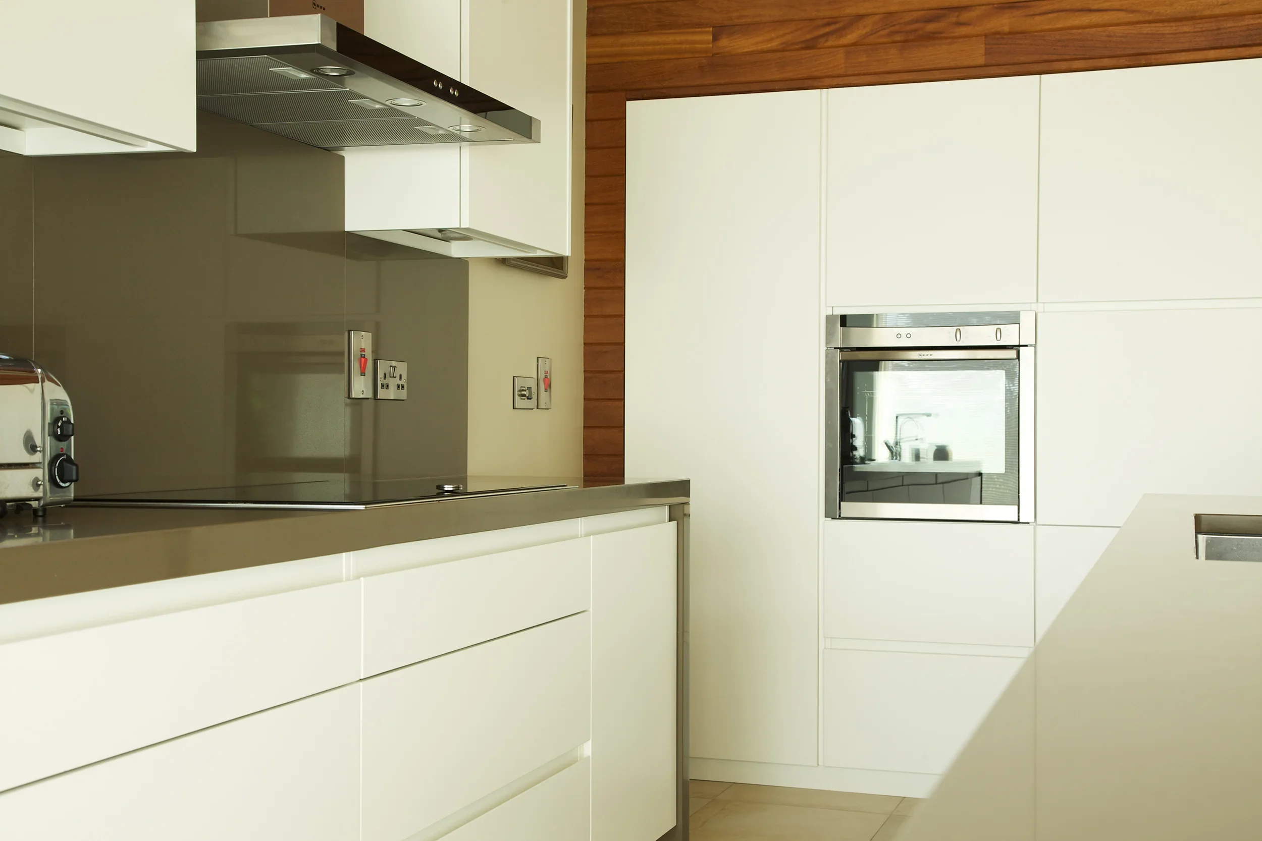 Matt Arctic White, Killiney Finishes: Matt Arctic White ‘Linno’ handleless doors. Long feature island with 60mm extra thick Silestone Unsui Slab work surfaces. Tall double oven wall storage unit.