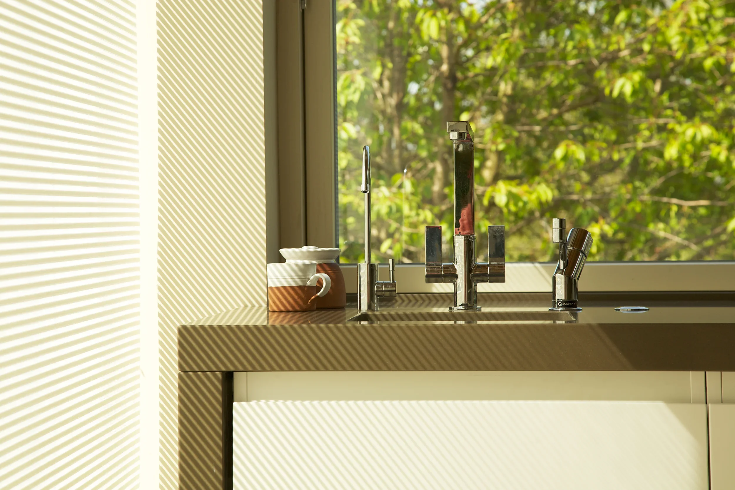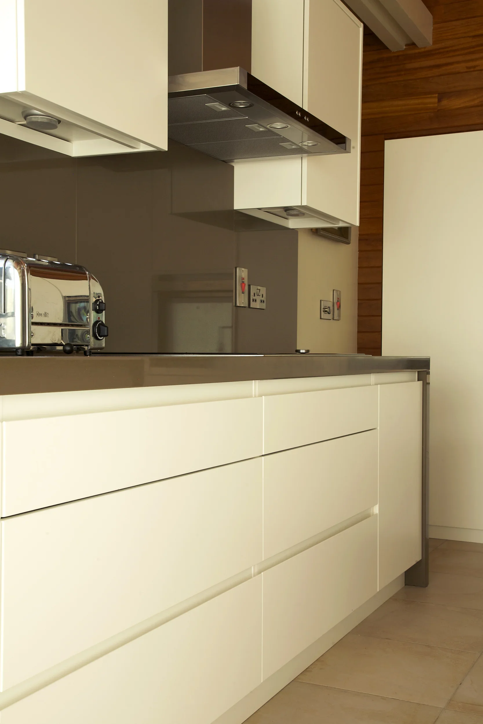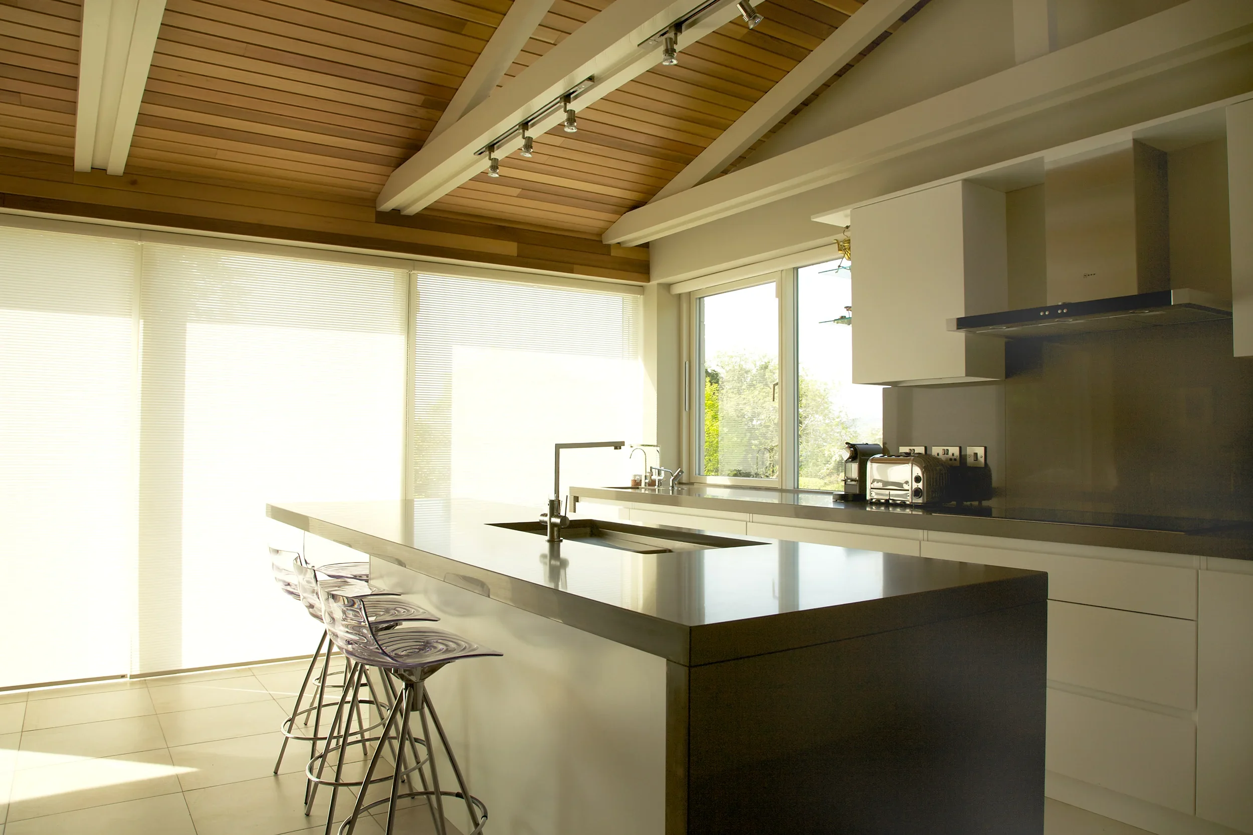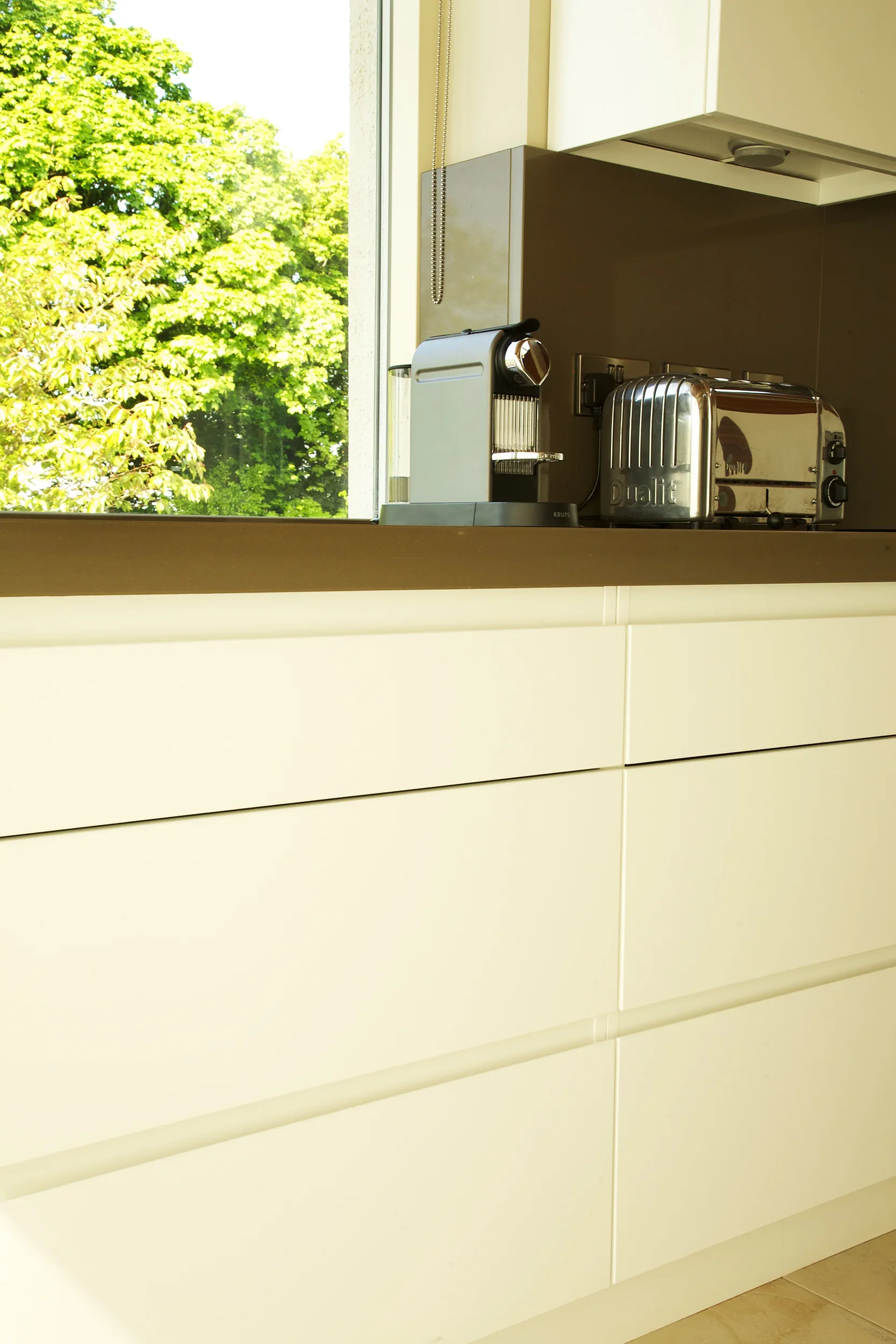 Matt Arctic White, Killiney Finishes: Matt Arctic White ‘Linno’ handleless doors. Long feature island with 60mm extra thick Silestone Unsui Slab work surfaces. Tall double oven wall storage unit.