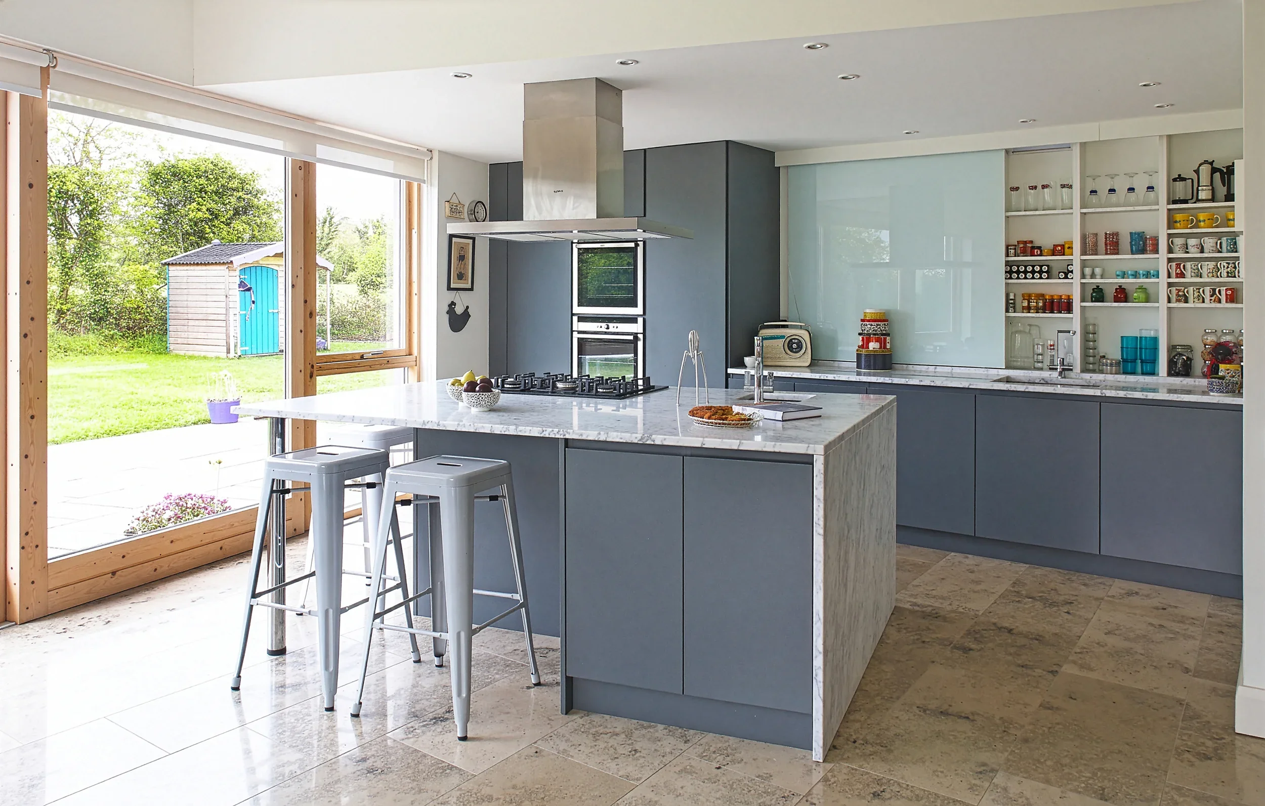 Mid Grey, Louth Finishes: Mid Grey ‘Linno’ handleless doors. Feature glazed sliding door shallow shelved storage. Large feature island with Carrera marble work surface and prep sink.