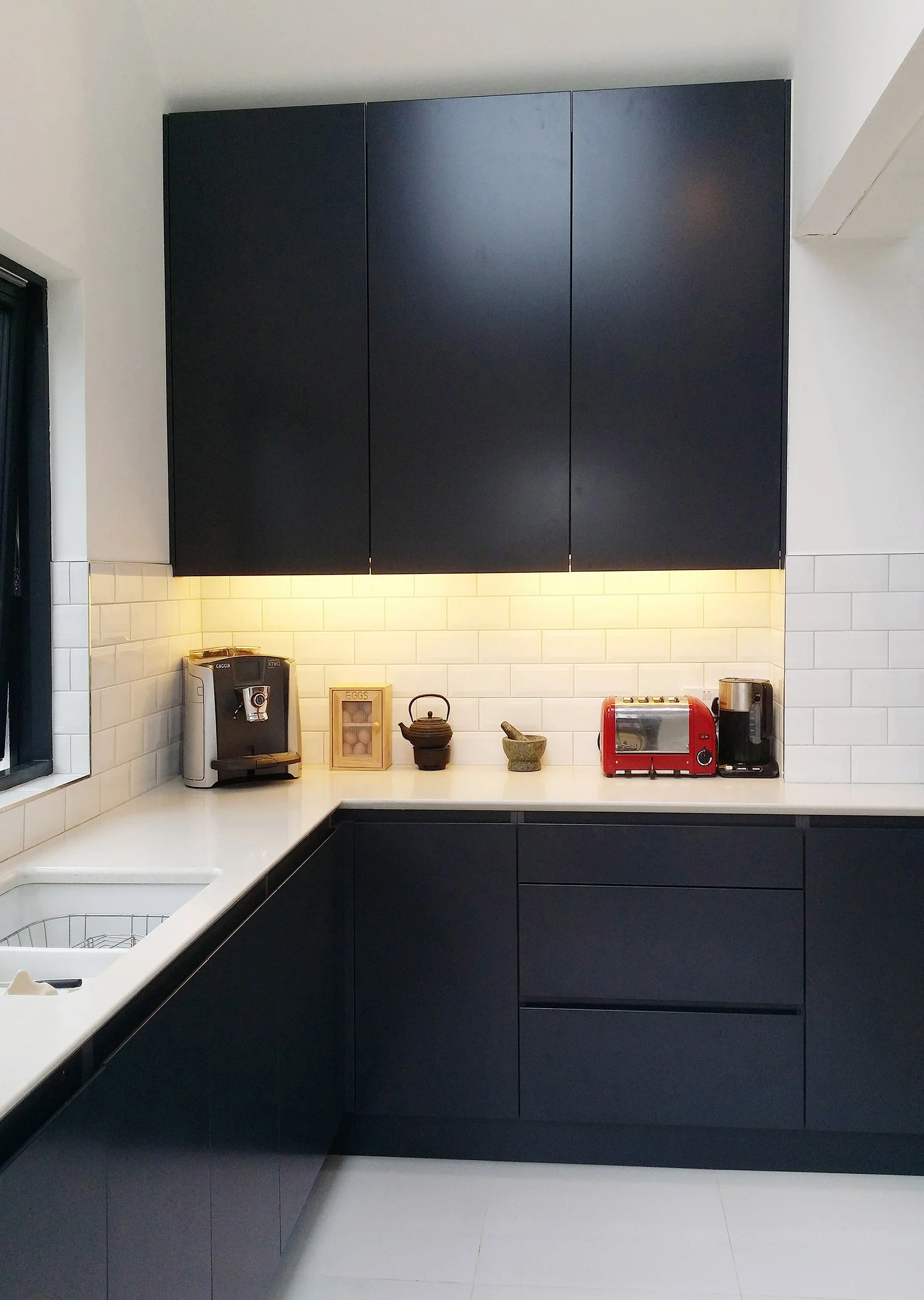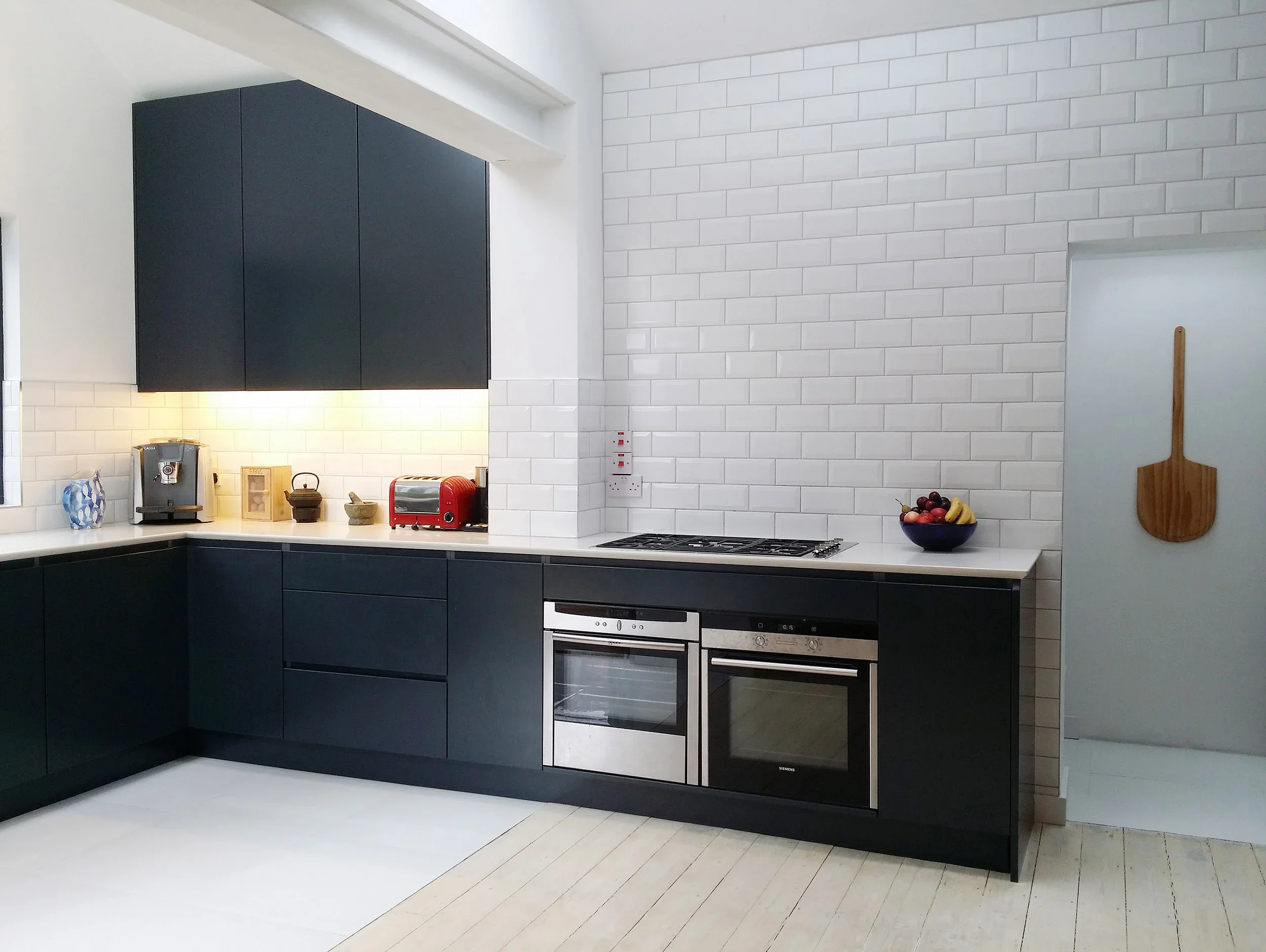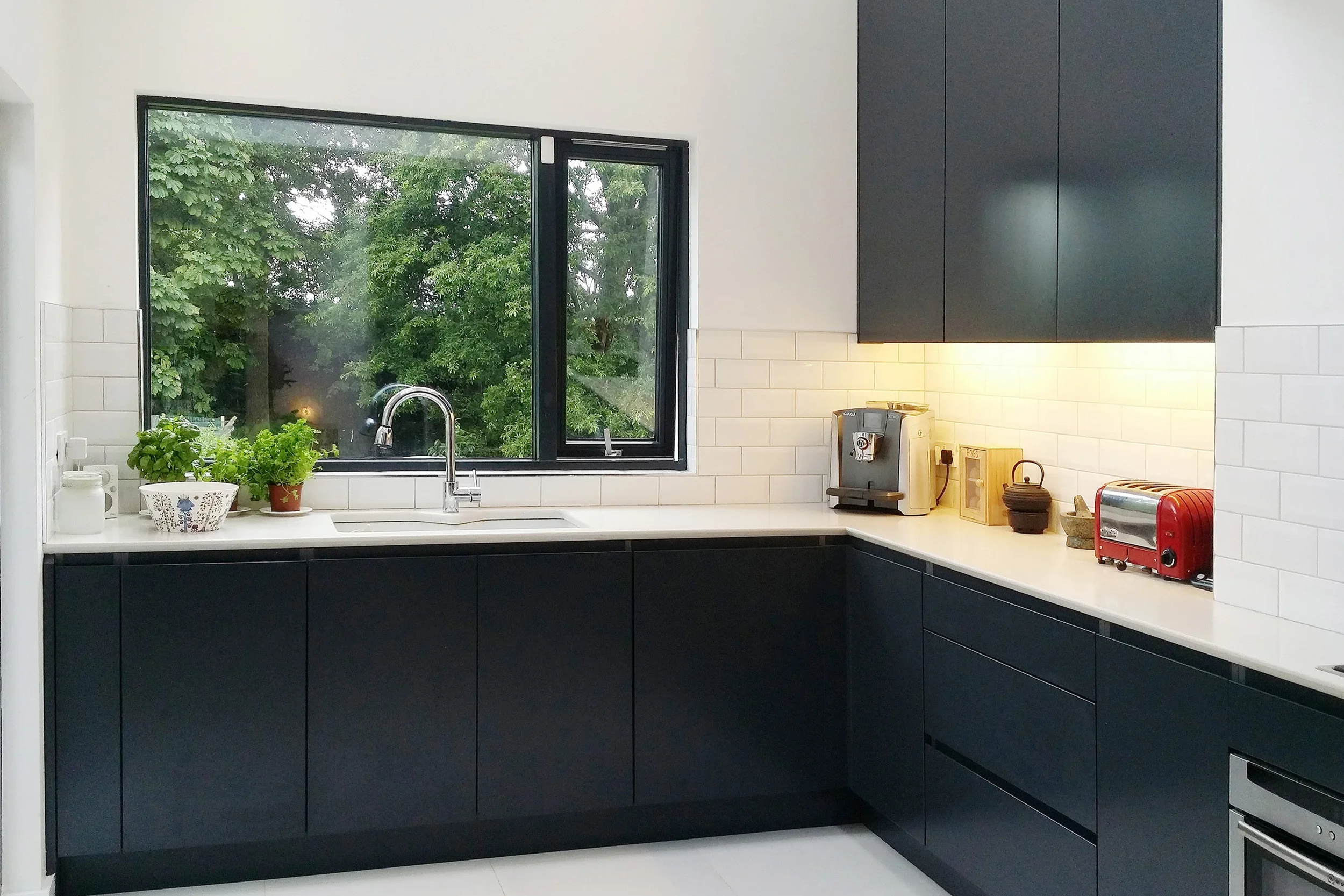 Stone Black, Churchtown Finishes: Stone Black ‘Linno’ handleless doors. Full height white Metro tiled backsplash. White Silestone work surfaces.